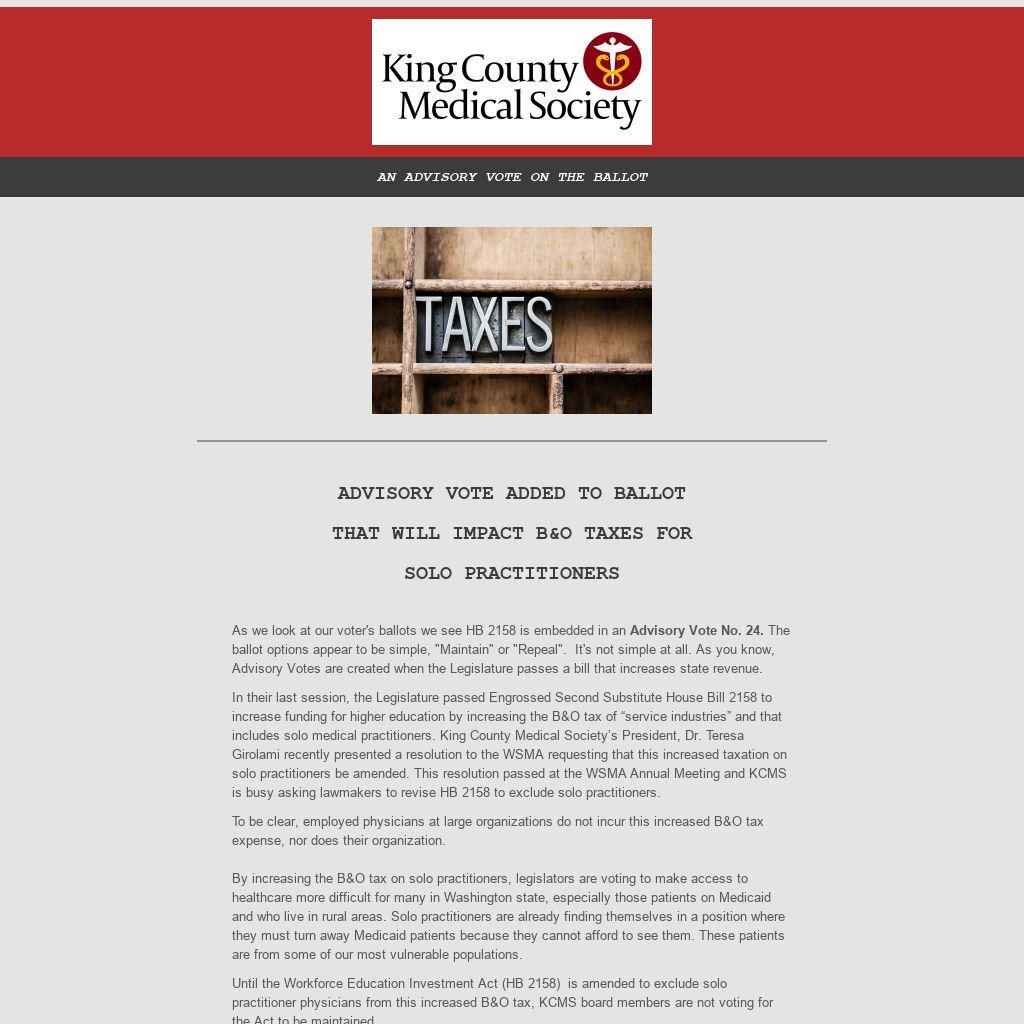 Until the Workforce Education Investment Act (HB 2158) is amended to exclude solo practitioner physicians from this increased B&O tax, KCMS board members are not voting for the Act to be maintained.