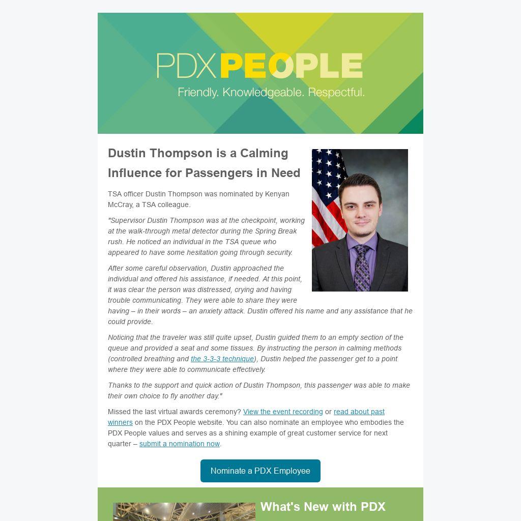 TSA officer Dustin Thompson was nominated by Kenyan McCray, a TSA colleague.