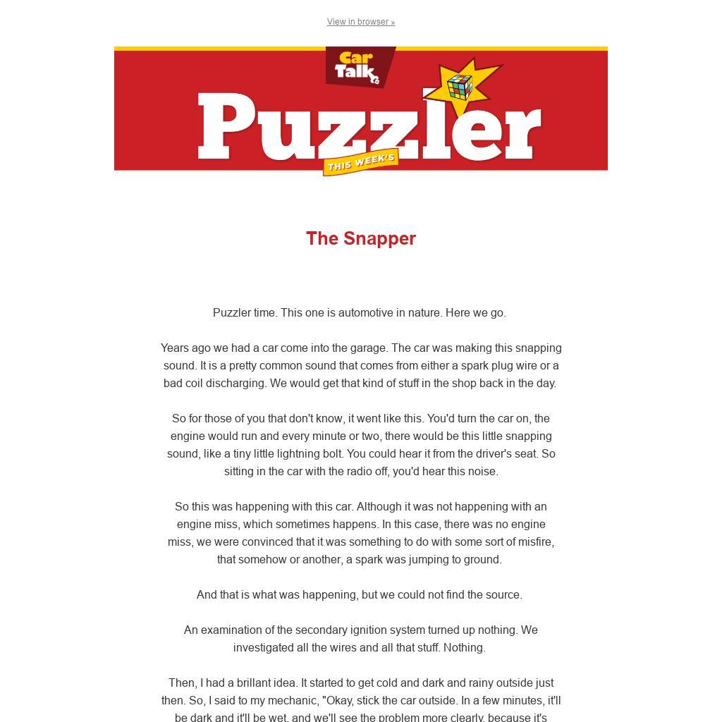 Years ago we had a car come into the garage. The car was making this snapping sound. It is a pretty common sound that comes from either a spark plug wire or a bad coil discharging. We would get that kind of stuff in the shop back in the day.