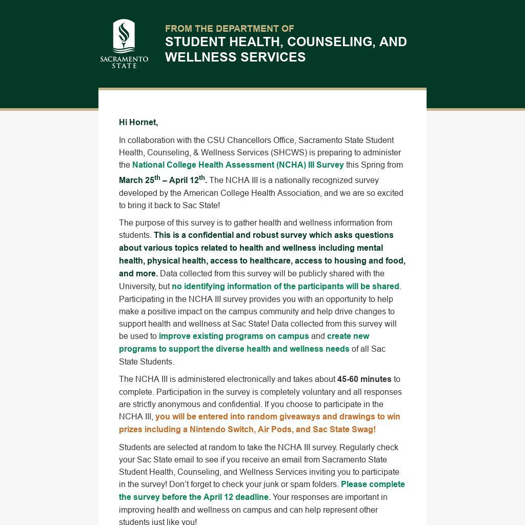 In collaboration with the CSU Chancellors Office, Sacramento State Student Health, Counseling, & Wellness Services (SHCWS) is preparing to administer the National College Health Assessment (NCHA) III Survey this Spring from March 25th – April 12th. The NCHA III is a nationally recognized survey developed by the American College Health Association, and we are so excited to bring it back to Sac State!