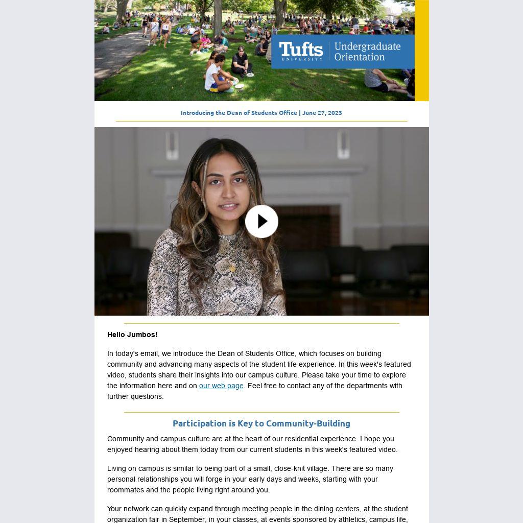 The offices within Student Life that are supported by me and my team focus on empowering your ability to thrive in this community and beyond. During your time at Tufts, we will help you develop and hone life skills that will prepare you to lead other communities and organizations throughout your lifetime.