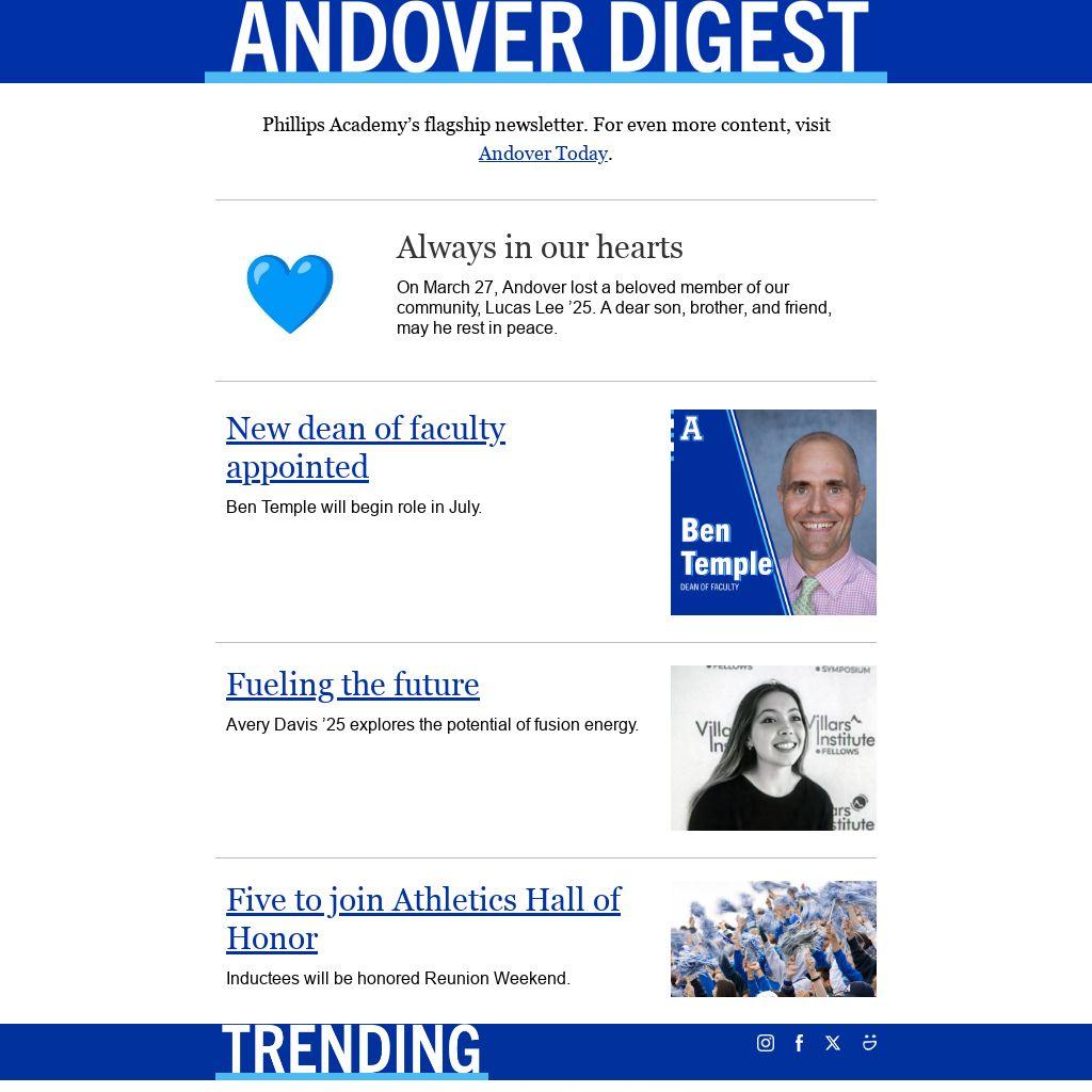 Phillips Academy’s flagship newsletter. For even more content, visit Andover Today.