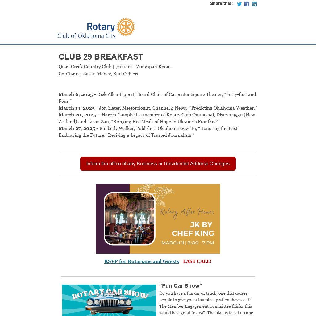 Rotary Club 29 has an online membership directory which contains current content information for all club members. The link to access the Club 29 directory can be found at the top of  the home page of  okcrotary.club or by clicking here.