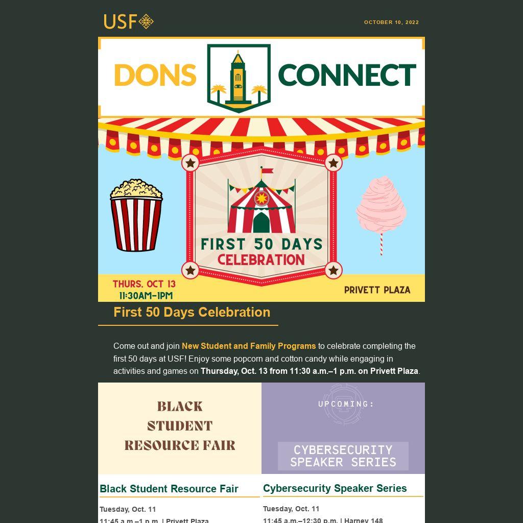 Come out and join New Student and Family Programs to celebrate completing the first 50 days at USF! Enjoy some popcorn and cotton candy while engaging in activities and games on Thursday, Oct. 13from 11:30 a.m.–1 p.m. on Privett Plaza.