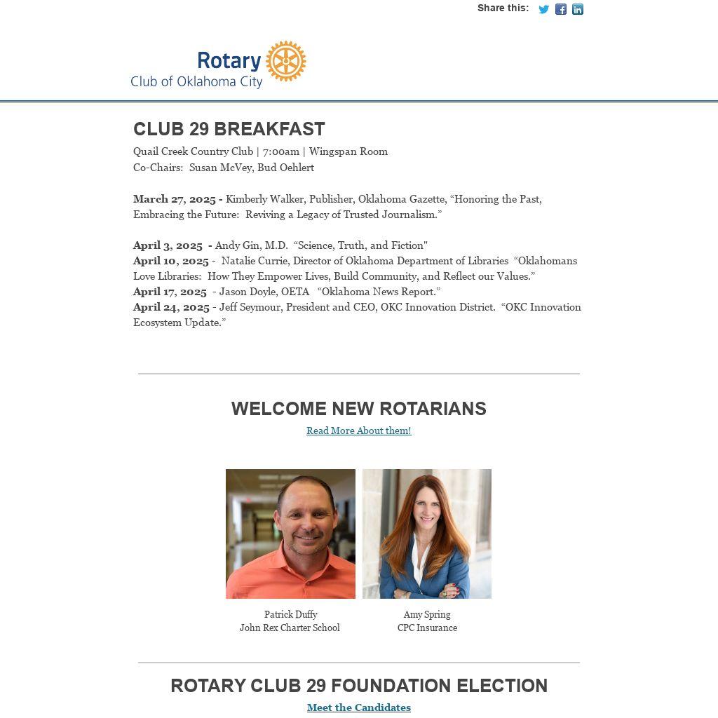 April 1, 2025 - High School Rotarian Day – “Accessible Health Care Panel-” Senator Carri Hicks, Jeanean Jones April 8, 2025 - Sean Burrage, Chancellor, Regents for Higher Education – “The Power of Higher Education: Transforming Lives and Building Oklahoma’s Workforce”