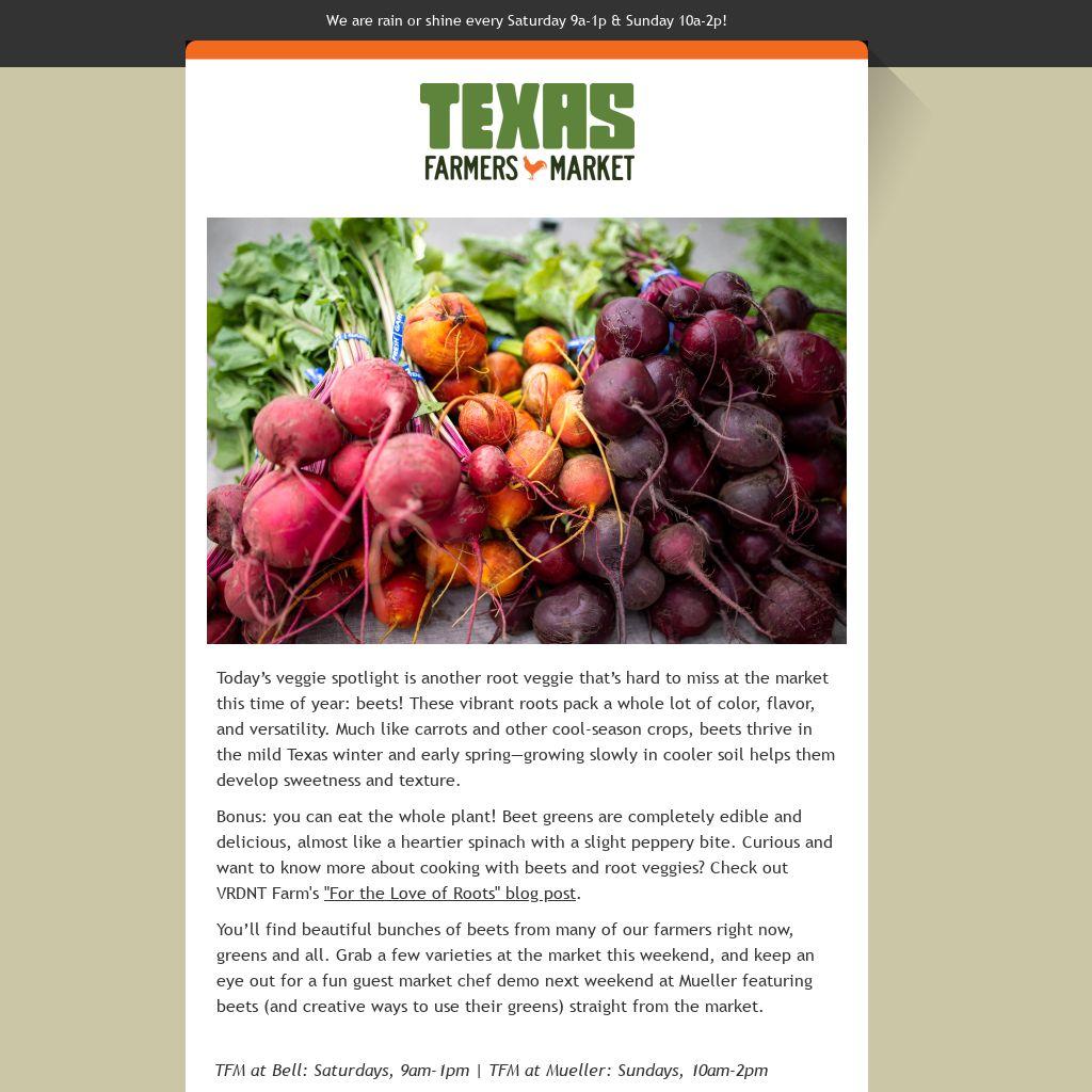 Today’s veggie spotlight is another root veggie that’s hard to miss at the market this time of year: beets! These vibrant roots pack a whole lot of color, flavor, and versatility. Much like carrots and other cool-season crops, beets thrive in the mild Texas winter and early spring—growing slowly in cooler soil helps them develop sweetness and texture.
