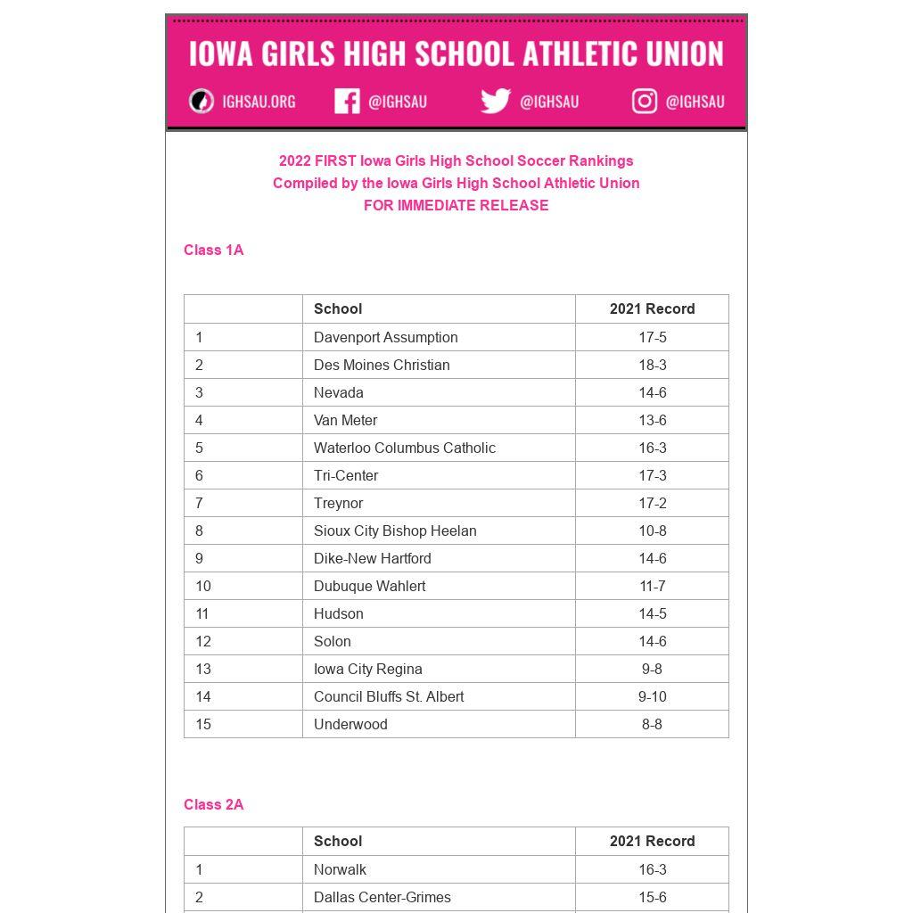 2022 FIRST Iowa Girls High School Soccer Rankings