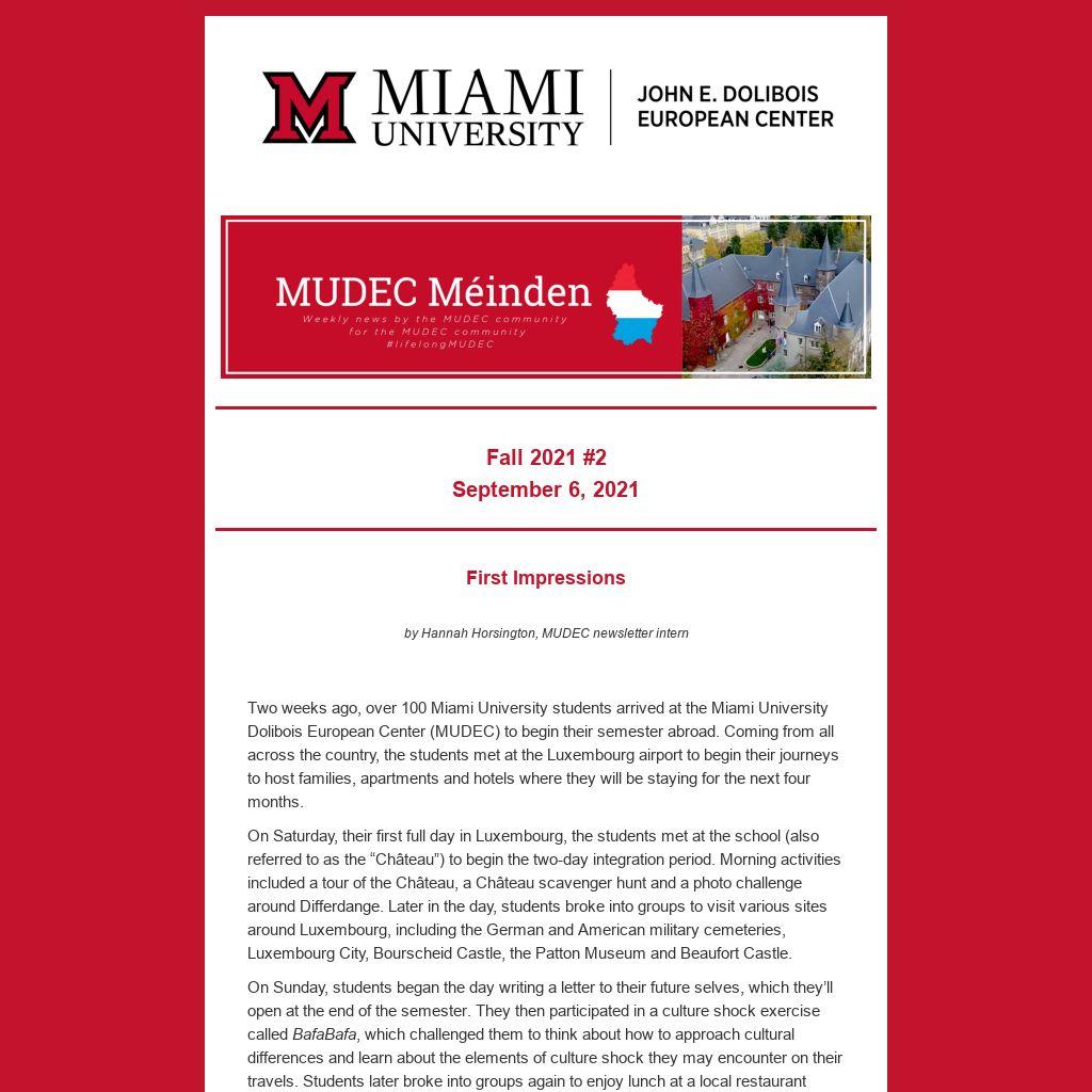 Two weeks ago, over 100 Miami University students arrived at the Miami University Dolibois European Center (MUDEC) to begin their semester abroad. Coming from all across the country, the students met at the Luxembourg airport to begin their journeys to host families, apartments and hotels where they will be staying for the next four months.