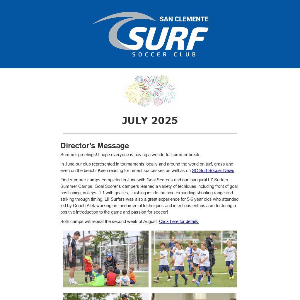In August, the annual Surf Club Players Only camp for all age groups is August 4-8. All Surf Club players are encouraged to attend this 5-day camp. Goal Scorer's for ages 7-12 and Lil' Surfer ages 4-6 are also available mid-August.