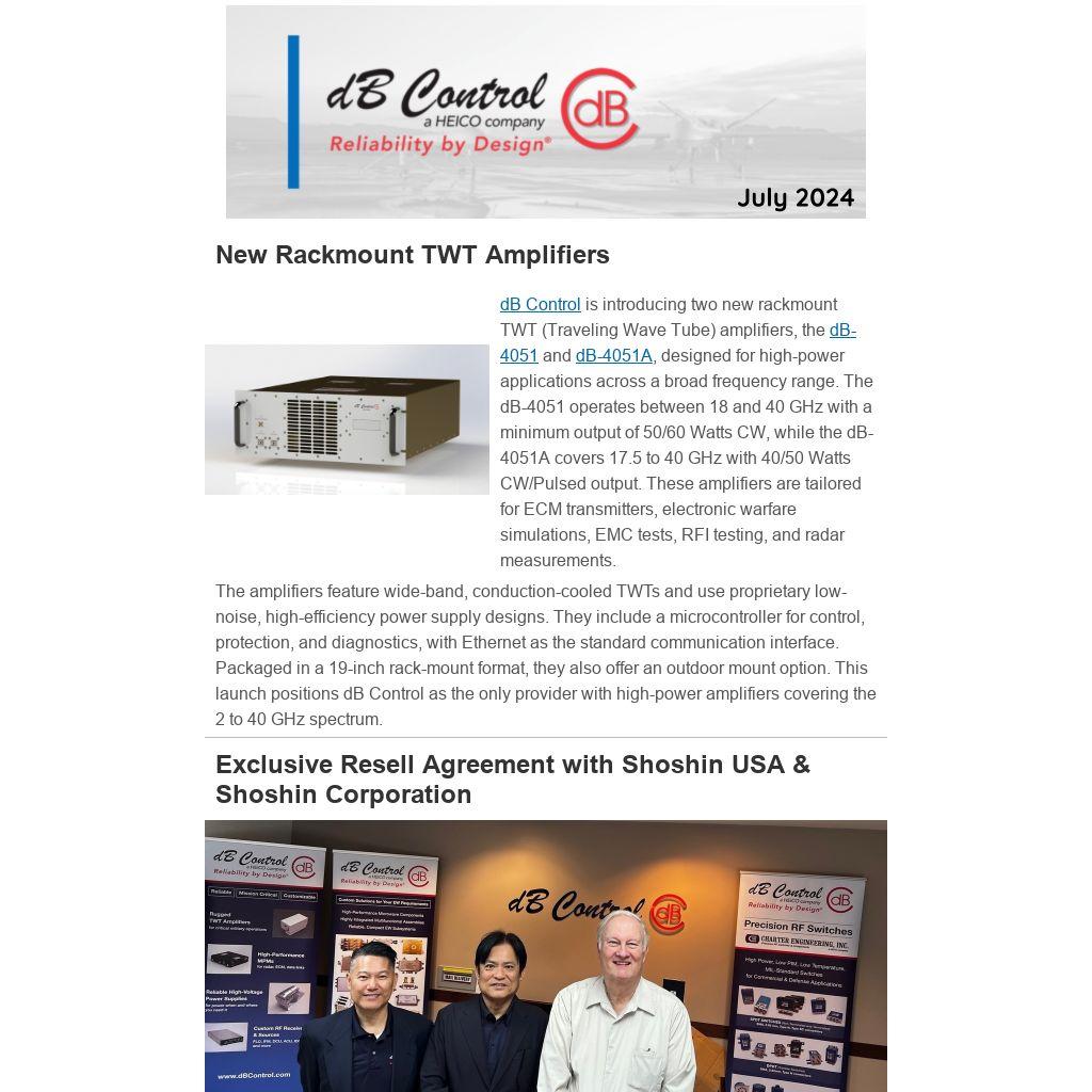 Last week, dB Control announced an exclusive distribution agreement with Shoshin USA and Shoshin Corporation to sell its TWT amplifiers, Microwave Power Modules (MPMs), and high-voltage products in Japan. The new product lineup includes: