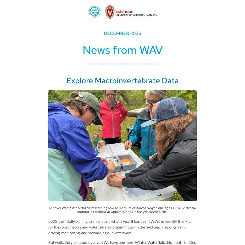 But wait...the year is not over yet! We have one more Winter Water Talk this month on Dec 18 to celebrate and learn about the great Wisconsin tradition of ice fishing. And our team and partners are already preparing for the 2026 Wisconsin Lakes and Rivers Convention in Stevens Point in April - registration is now open! Keep reading for a sneak peek.