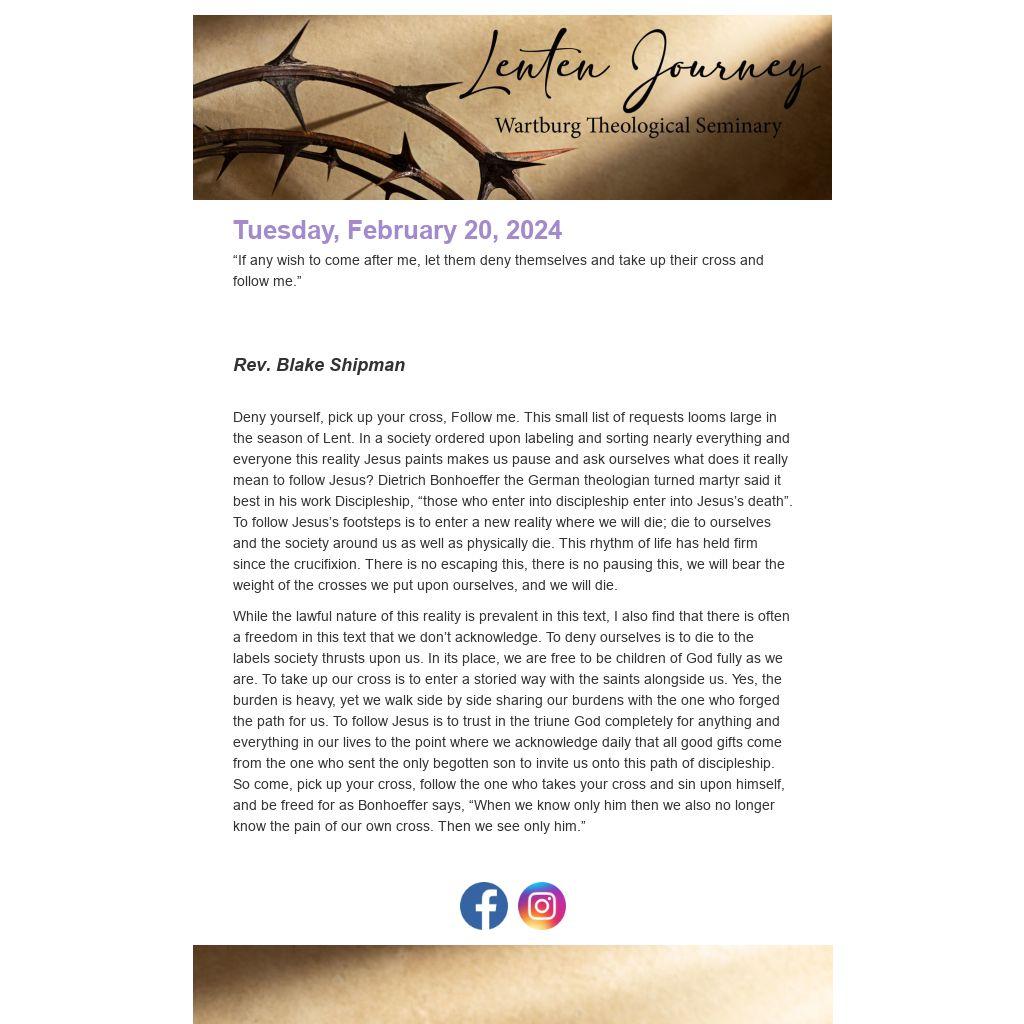 Deny yourself, pick up your cross, Follow me. This small list of requests looms large in the season of Lent. In a society ordered upon labeling and sorting nearly everything and everyone this reality Jesus paints makes us pause and ask ourselves what does it really mean to follow Jesus? Dietrich Bonhoeffer the German theologian turned martyr said it best in his work Discipleship, “those who enter into discipleship enter into Jesus’s death”. To follow Jesus’s footsteps is to enter a new reality where we will die; die to ourselves and the society around us as well as physically die. This rhythm of life has held firm since the crucifixion. There is no escaping this, there is no pausing this, we will bear the weight of the crosses we put upon ourselves, and we will die.