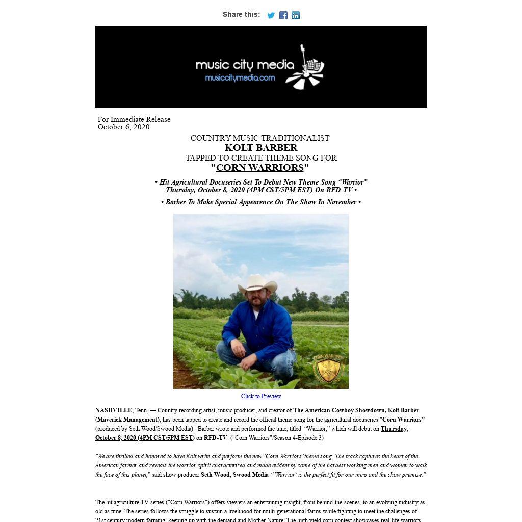 NASHVILLE, Tenn. — Country recording artist, music producer, and creator of The American Cowboy Showdown, Kolt Barber (Maverick Management), has been tapped to create and record the official theme song for the agricultural docuseries "Corn Warriors" (produced by Seth Wood/Swood Media). Barber wrote and performed the tune, titled “Warrior,” which will debut on Thursday, October 8, 2020 (4PM CST/5PM EST) on RFD-TV. ("Corn Warriors"/Season 4-Episode 3)