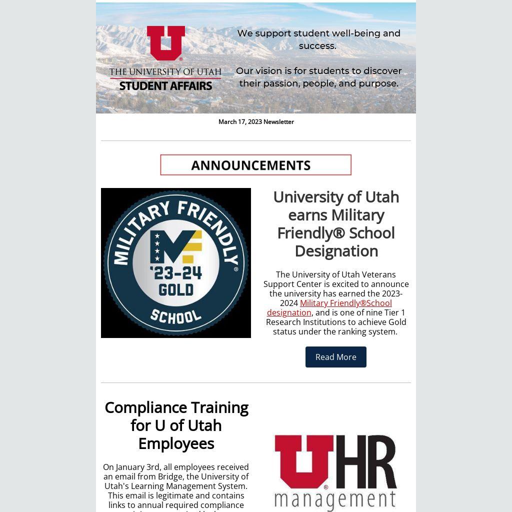 On January 3rd, all employees received an email from Bridge, the University of Utah's Learning Management System. This email is legitimate and contains links to annual required compliance trainings as required by law.