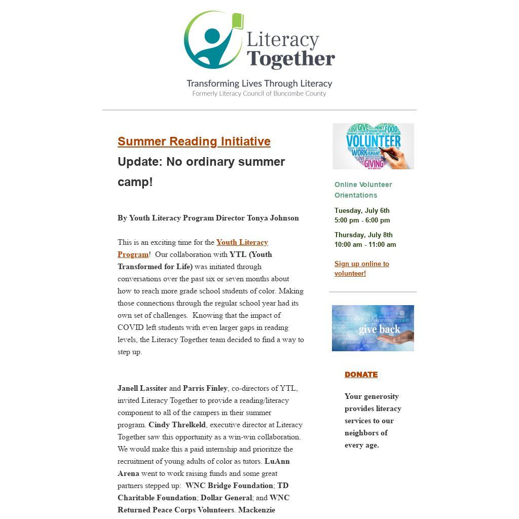 We have two online volunteer orientation meetings coming up: July 6th at 5:00 pm and July 8th at 10:00 am. Is someone you know ready to support a neighbor? Please help us spread the word! People can sign up online to volunteer or they can send an email to laura@lit-together.org.