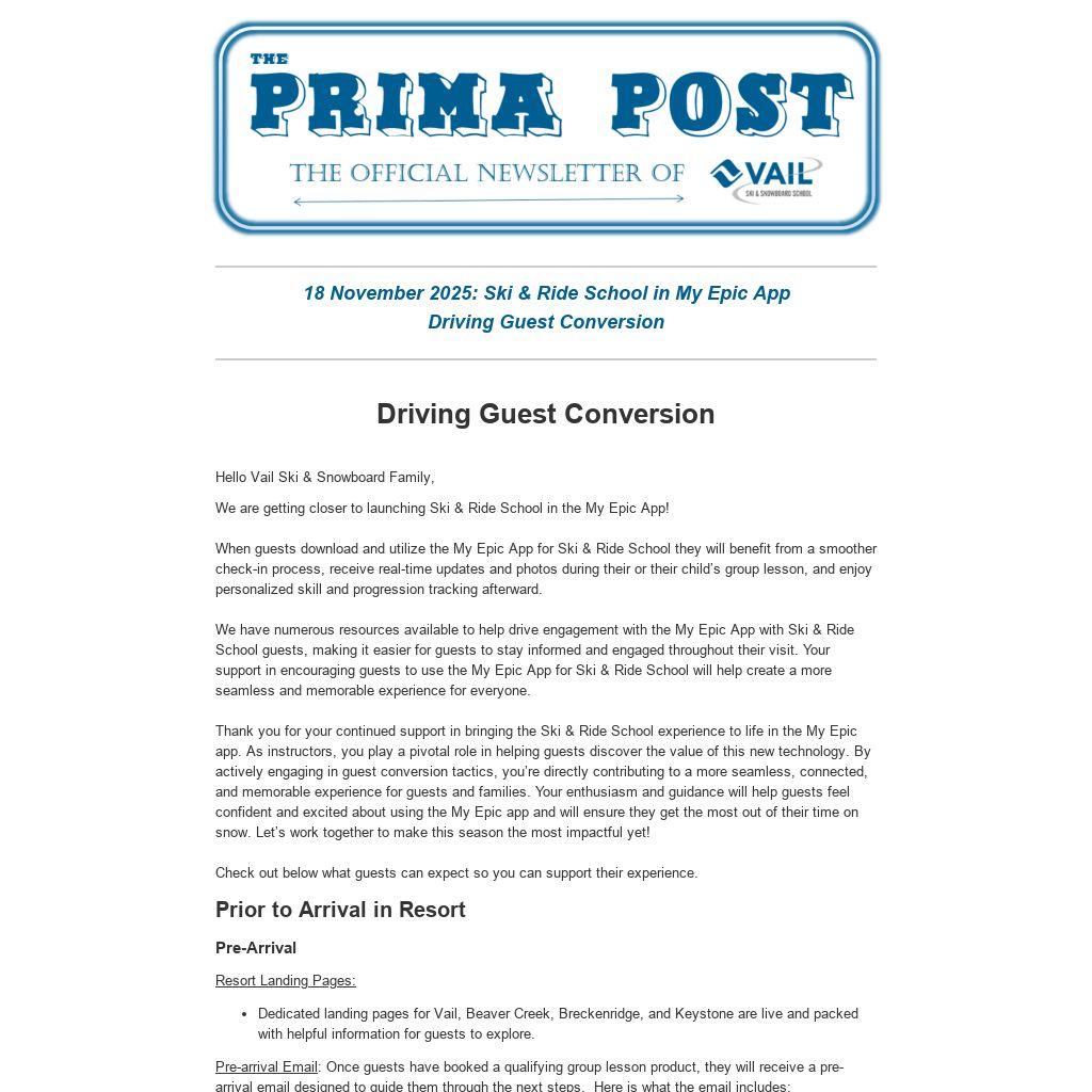 Thank you for your continued support in bringing the Ski & Ride School experience to life in the My Epic app. As instructors, you play a pivotal role in helping guests discover the value of this new technology. By actively engaging in guest conversion tactics, you’re directly contributing to a more seamless, connected, and memorable experience for guests and families. Your enthusiasm and guidance will help guests feel confident and excited about using the My Epic app and will ensure they get the most out of their time on snow. Let’s work together to make this season the most impactful yet!