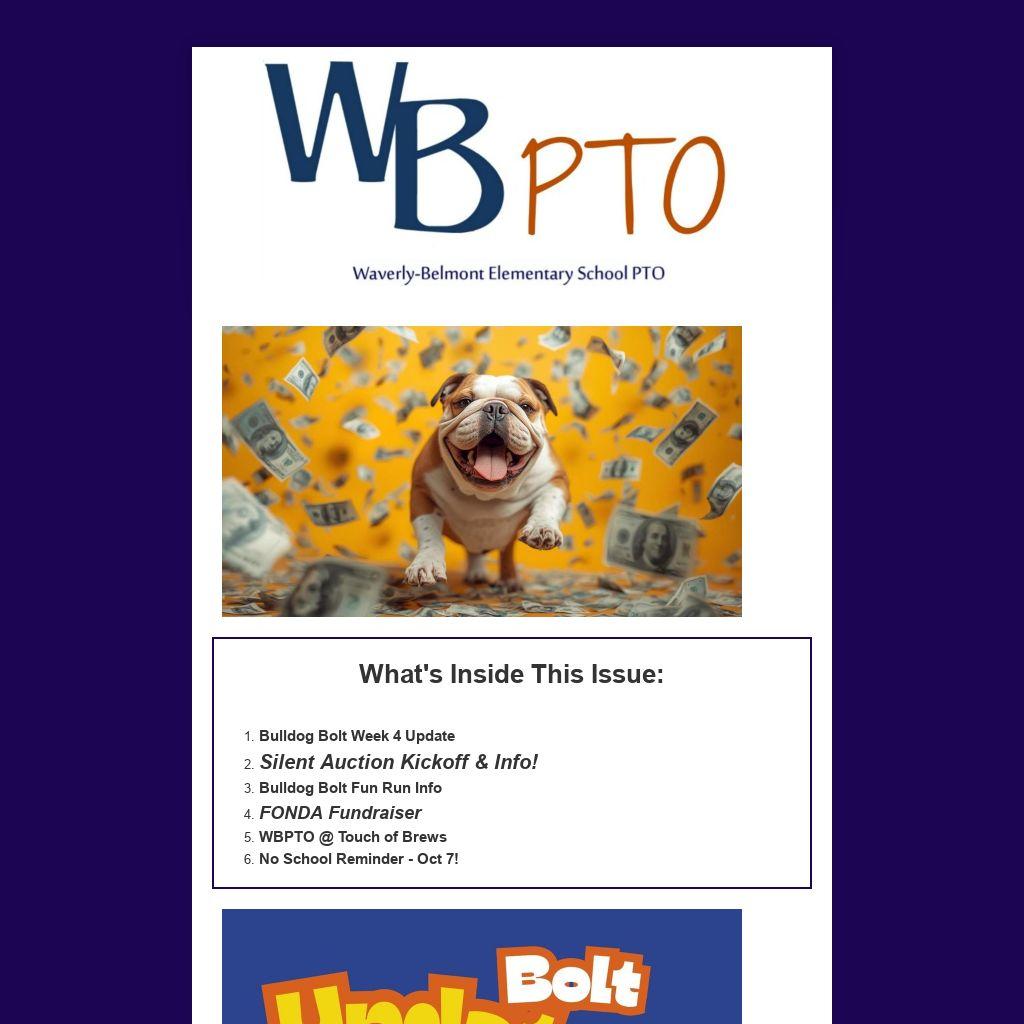 ATTEND: WB PTO will have a booth in the Kid Zone section at Touch of Brews this year from 11am-5pm in Sevier Park! There will be arts & crafts activities for the kiddos plus a photo op with Belmont the Bulldog! Donations made at the booth will go directly towards the overall Bulldog Bolt fundraising goal. WB families and friends can purchase tickets through this designated ticket link and a portion of the proceeds will also go towards the Bulldog Bolt, so please share it with anyone who is planning on attending! (Note: Kids under 12 are free.)