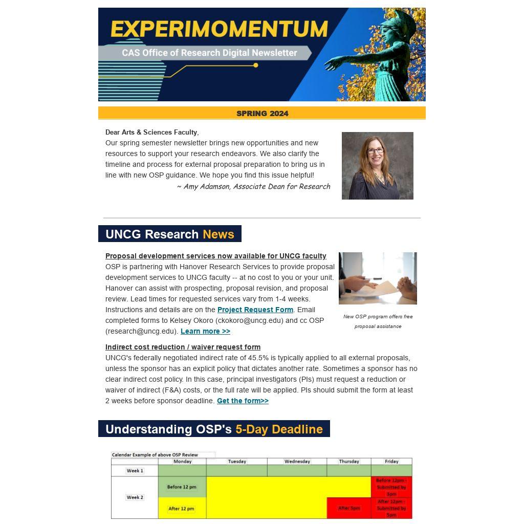 Dear Arts & Sciences Faculty, Our spring semester newsletter brings new opportunities and new resources to support your research endeavors. We also clarify the timeline and process for external proposal preparation to bring us in line with new OSP guidance. We hope you find this issue helpful! ~ Amy Adamson, Associate Dean for Research
