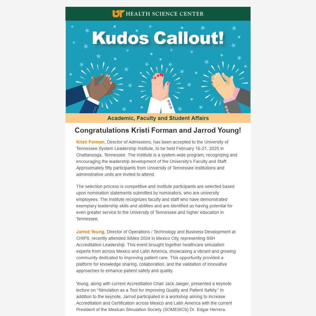 Kristi Forman, Director of Admissions, has been accepted to the University of Tennessee System Leadership Institute, to be held February 16-21, 2025 in Chattanooga, Tennessee. The Institute is a system-wide program, recognizing and encouraging the leadership development of the University’s Faculty and Staff. Approximately fifty participants from University of Tennessee institutions and administrative units are invited to attend.