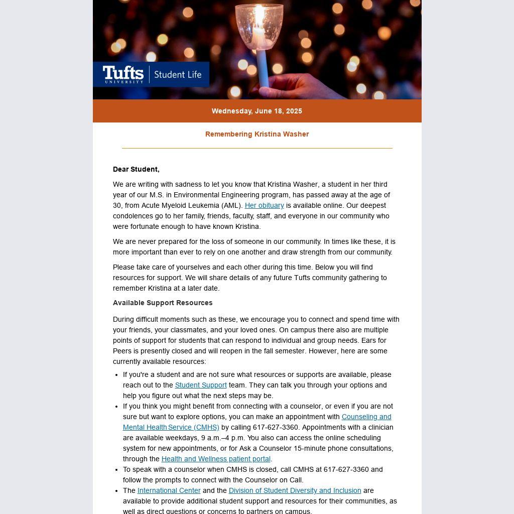 Please take care of yourselves and each other during this time. Below you will find resources for support. We will share details of any future Tufts community gathering to remember Kristina at a later date.