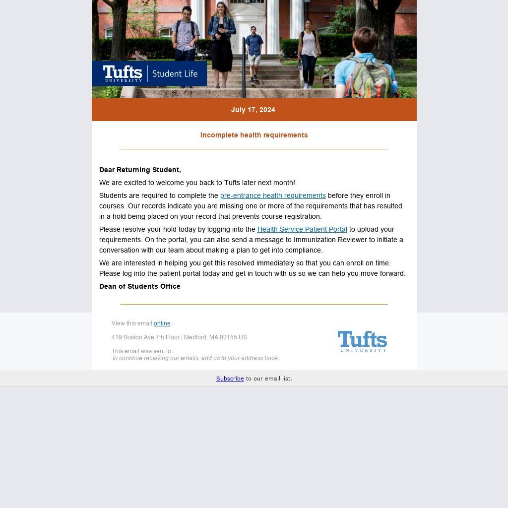 Please resolve your hold today by logging into the Health Service Patient Portal to upload your requirements. On the portal, you can also send a message to Immunization Reviewer to initiate a conversation with our team about making a plan to get into compliance.