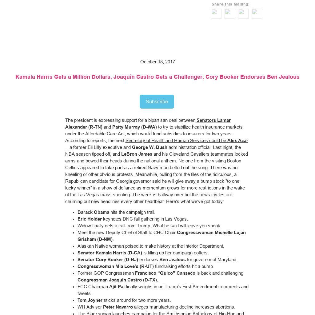 The president is expressing support for a bipartisan deal between Senators Lamar Alexander (R-TN) and Patty Murray (D-WA) to try to stabilize health insurance markets under the Affordable Care Act, which would fund subsidies to insurers for two years. According to reports, the next Secretary of Health and Human Services could be Alex Azar -- a former Eli Lilly executive and George W. Bush administration official. Last night, the NBA season tipped off, and LeBron James and his Cleveland Cavaliers teammates locked arms and bowed their heads during the national anthem. No one from the visiting Boston Celtics appeared to take part as a retired Navy man belted out the song. There was no kneeling or other obvious protests. Meanwhile, pulling from the files of the ridiculous, a Republican candidate for Georgia governor said he will give away a bump stock "to one lucky winner" in a show of defiance as momentum grows for more restrictions in the wake of the Las Vegas mass shooting. The week is halfway over but the news cycles are churning out new headlines every other heartbeat. Here’s what we’ve got today: