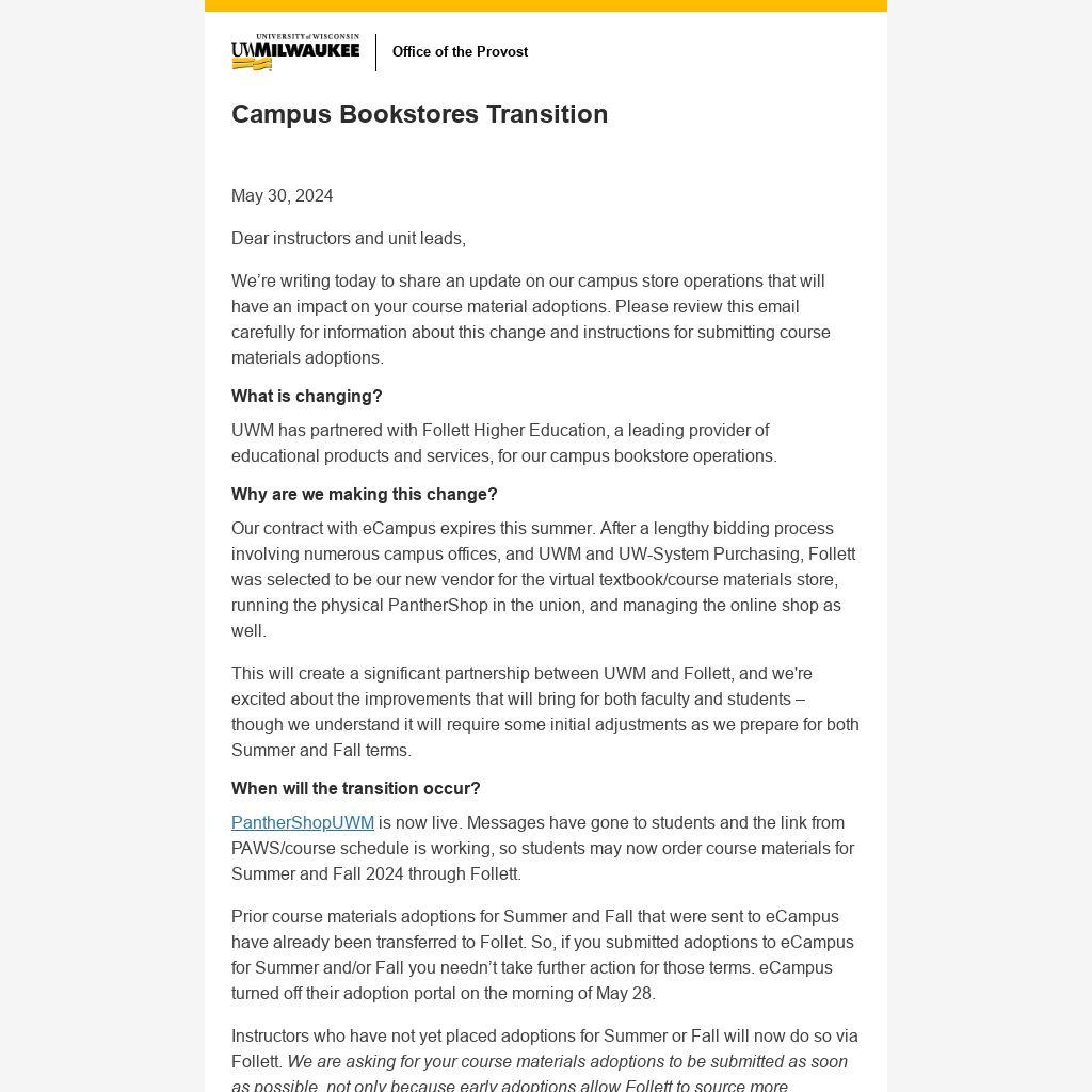 This will create a significant partnership between UWM and Follett, and we're excited about the improvements that will bring for both faculty and students – though we understand it will require some initial adjustments as we prepare for both Summer and Fall terms.