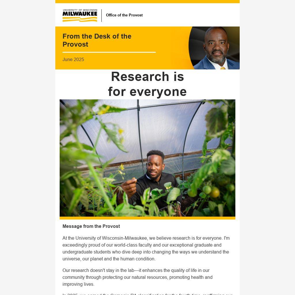 At the University of Wisconsin-Milwaukee, we believe research is for everyone. I'm exceedingly proud of our world-class faculty and our exceptional graduate and undergraduate students who dive deep into changing the ways we understand the universe, our planet and the human condition.