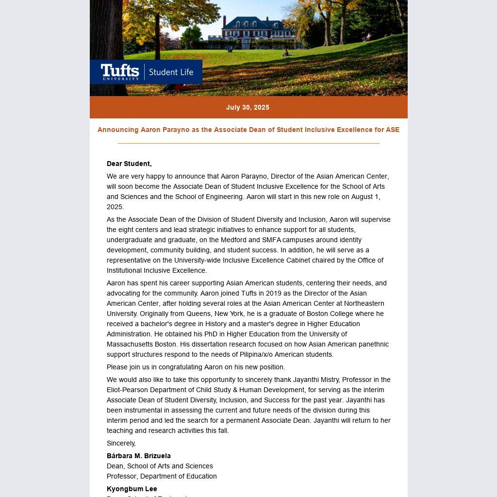 We are very happy to announce that Aaron Parayno, Director of the Asian American Center, will soon become the Associate Dean of Student Inclusive Excellence for the School of Arts and Sciences and the School of Engineering. Aaron will start in this new role on August 1, 2025.