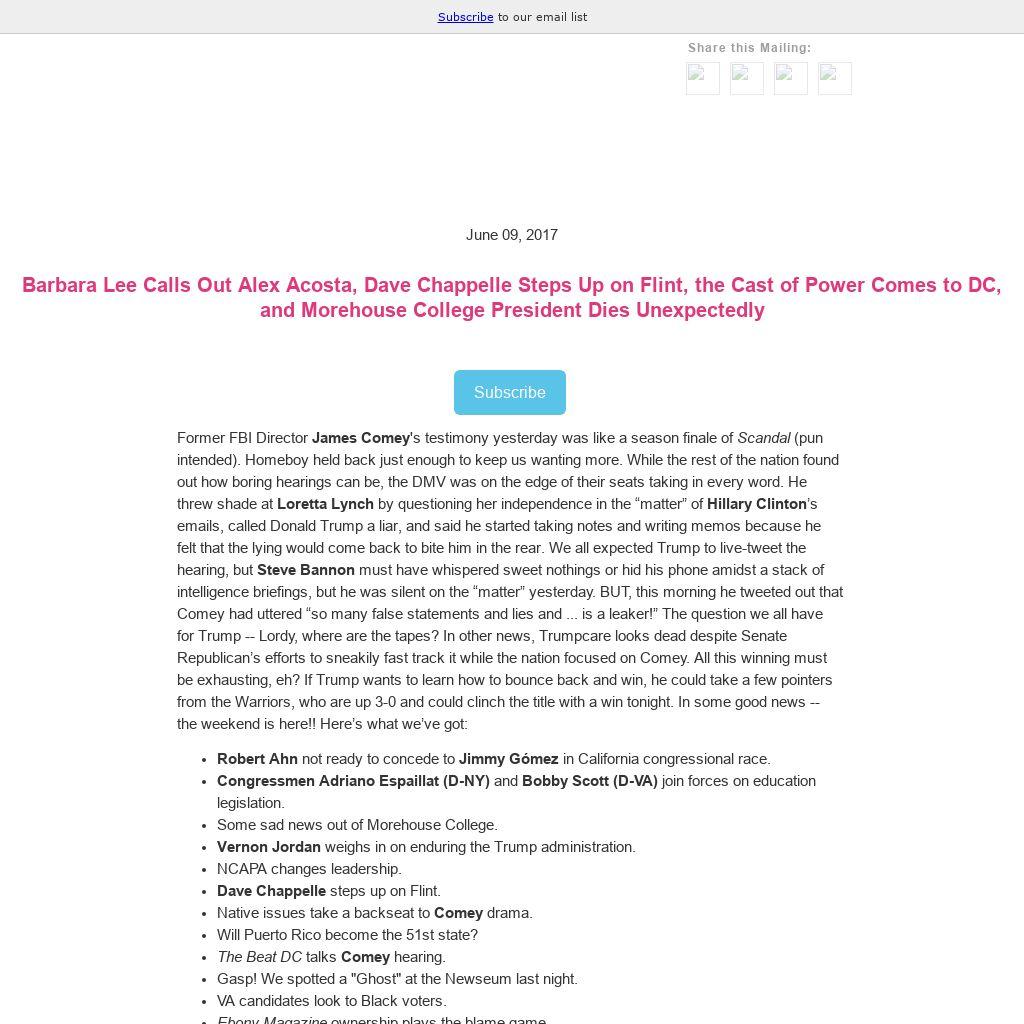 | Former FBI Director James Comey's testimony yesterday was like a season finale of Scandal (pun intended). Homeboy held back just enough to keep us wanting more. While the rest of the nation found out how boring hearings can be, the DMV was on the edge of their seats taking in every word. He threw shade at Loretta Lynch by questioning her independence in the “matter” of Hillary Clinton’s emails, called Donald Trump a liar, and said he started taking notes and writing memos because he felt that the lying would come back to bite him in the rear. We all expected Trump to live-tweet the hearing, but Steve Bannon must have whispered sweet nothings or hid his phone amidst a stack of intelligence briefings, but he was silent on the “matter” yesterday. BUT, this morning he tweeted out that Comey had uttered “so many false statements and lies and ... is a leaker!” The question we all have for Trump -- Lordy, where are the tapes? In other news, Trumpcare looks dead despite Senate Republican’s efforts to sneakily fast track it while the nation focused on Comey. All this winning must be exhausting, eh? If Trump wants to learn how to bounce back and win, he could take a few pointers from the Warriors, who are up 3-0 and could clinch the title with a win tonight. In some good news -- the weekend is here!! Here’s what we’ve got: