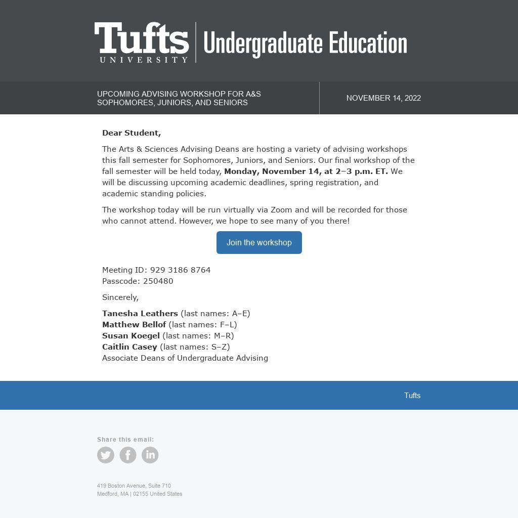 The Arts & Sciences Advising Deans are hosting a variety of advising workshops this fall semester for Sophomores, Juniors, and Seniors. Our final workshop of the fall semester will be held today, Monday, November 14, at 2–3 p.m. ET. We will be discussing upcoming academic deadlines, spring registration, and academic standing policies.