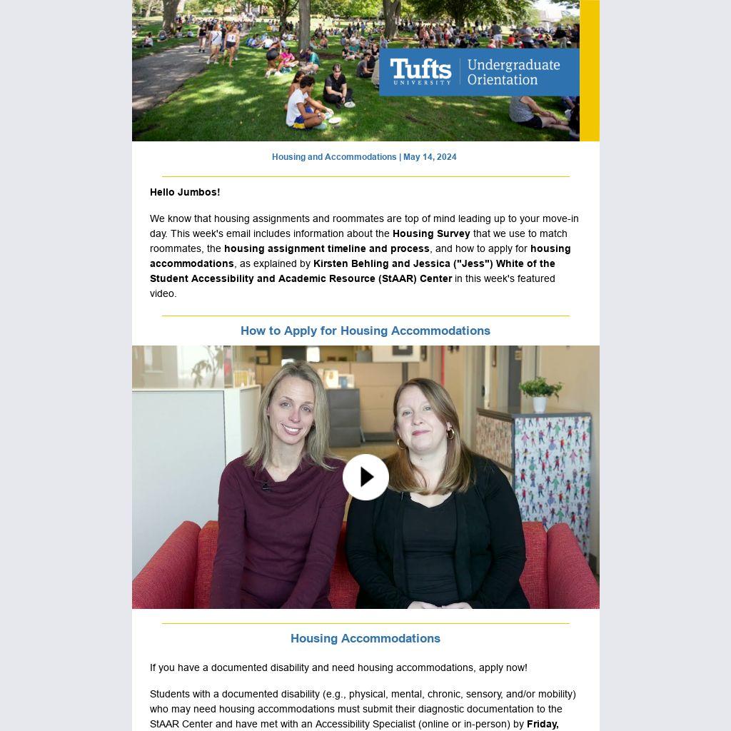 We know that housing assignments and roommates are top of mind leading up to your move-in day. This week's email includes information about the Housing Survey that we use to match roommates, the housing assignment timeline and process, and how to apply for housing accommodations, as explained by Kirsten Behling and Jessica ("Jess") White of the Student Accessibility and Academic Resource (StAAR) Center in this week's featured video.