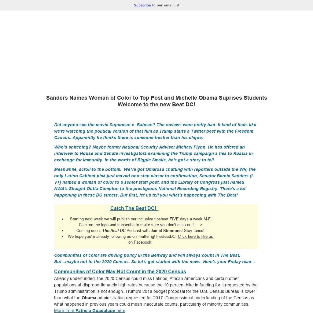 Meanwhile, scroll to the bottom. We've got Omarosa chatting with reporters outside the WH, the only Latino Cabinet pick just moved one step closer to confirmation, Senator Bernie Sanders (I-VT) named a woman of color to a senior staff post, and the Library of Congress just named NWA's Straight Outta Compton to the prestigious National Recording Registry. There's a lot happening in these DC streets. But first, let us tell you what's happening with The Beat!