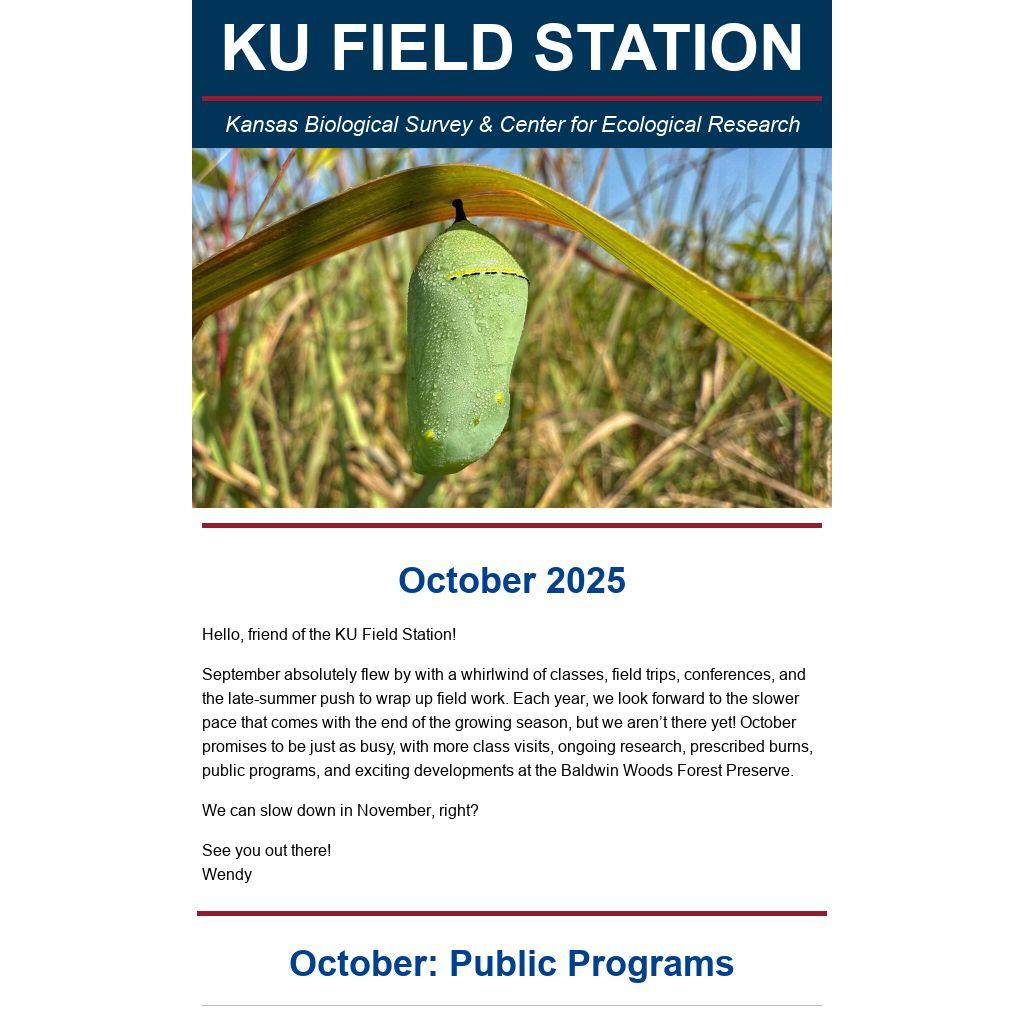 This is the monthly newsletter for the University of Kansas Field Station community. Each month, we share details about upcoming public programs, volunteer opportunities, and highlights from the month before.