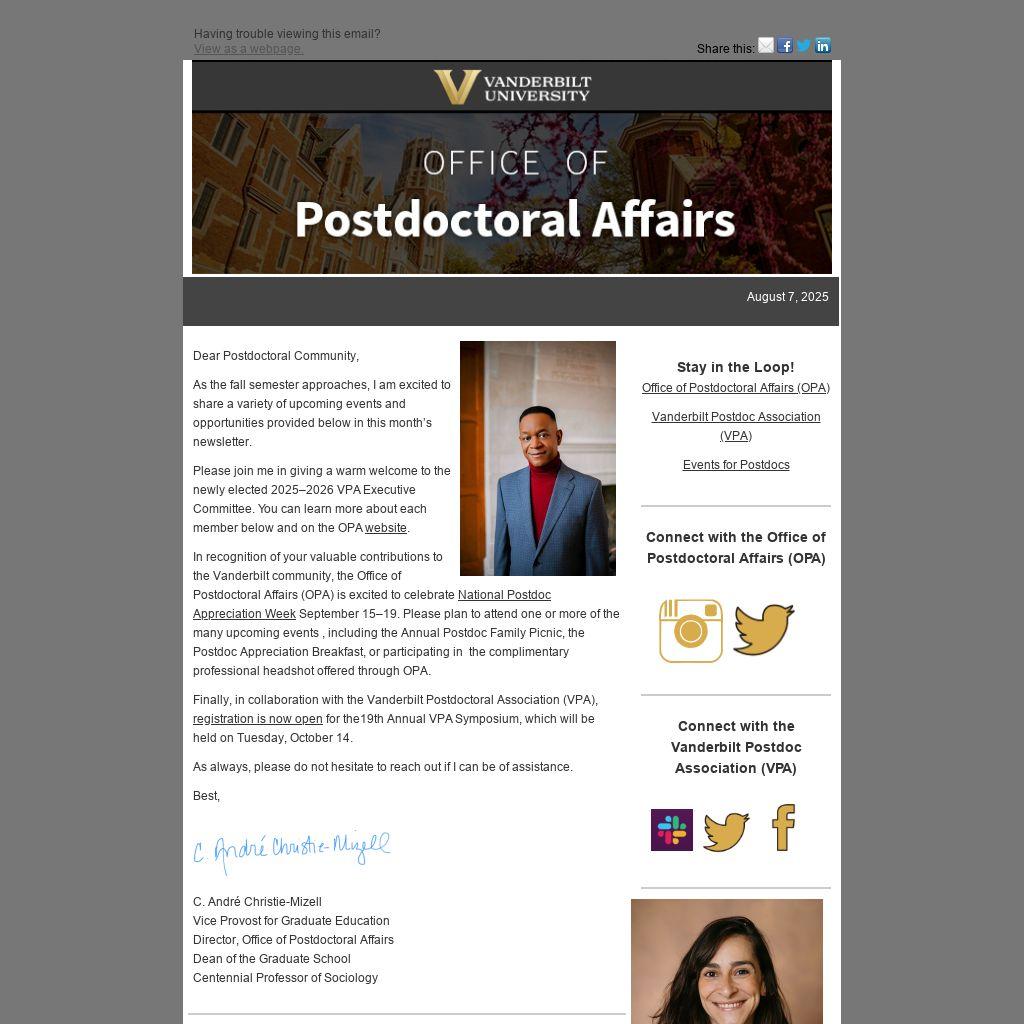 Finally, in collaboration with the Vanderbilt Postdoctoral Association (VPA), registration is now open for the19th Annual VPA Symposium, which will be held on Tuesday, October 14.