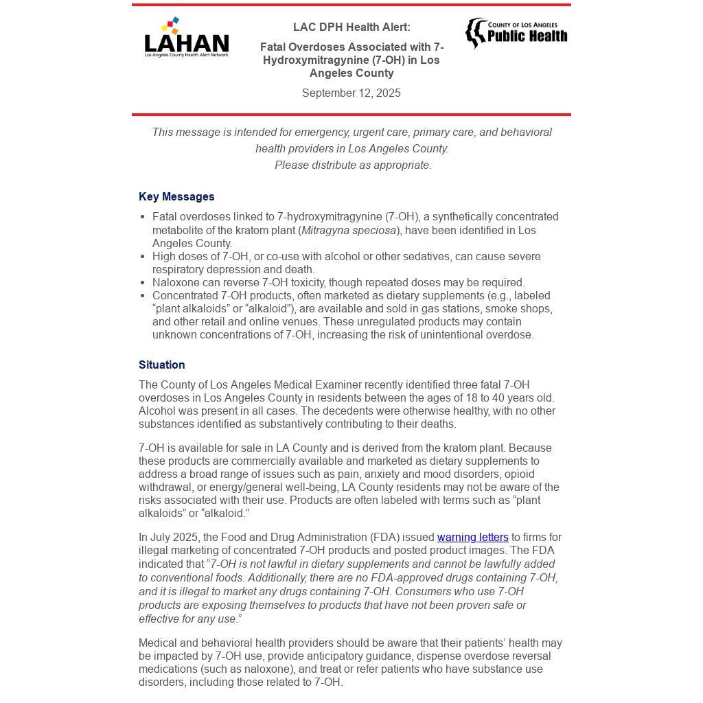 Fatal overdoses linked to 7-hydroxymitragynine (7-OH), a synthetically concentrated metabolite of the kratom plant (Mitragyna speciosa), have been identified in Los Angeles County.