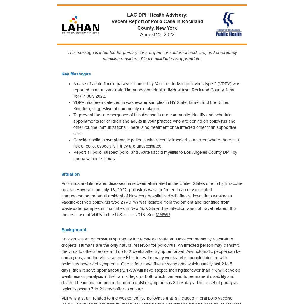 This communication was sent by Sharon Balter, MD, Director, Division of Communicable Disease Control and Prevention, Los Angeles County Department of Public Health.