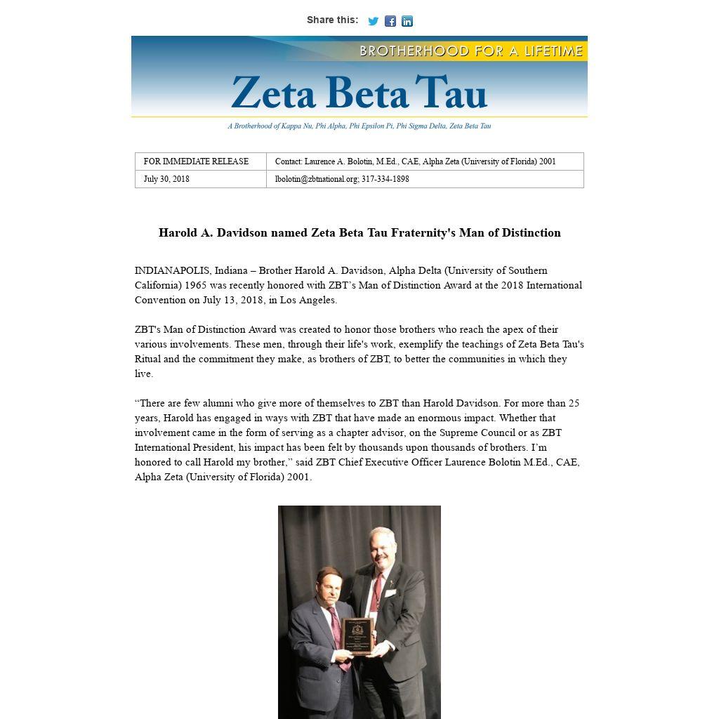 “There are few alumni who give more of themselves to ZBT than Harold Davidson. For more than 25 years, Harold has engaged in ways with ZBT that have made an enormous impact. Whether that involvement came in the form of serving as a chapter advisor, on the Supreme Council or as ZBT International President, his impact has been felt by thousands upon thousands of brothers. I’m honored to call Harold my brother,” said ZBT Chief Executive Officer Laurence Bolotin M.Ed., CAE, Alpha Zeta (University of Florida) 2001.