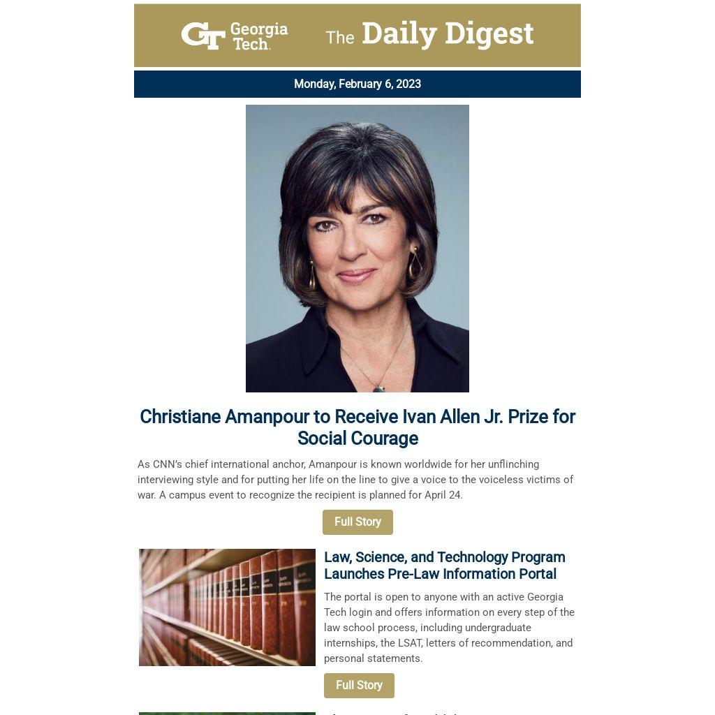 As CNN’s chief international anchor, Amanpour is known worldwide for her unflinching interviewing style and for putting her life on the line to give a voice to the voiceless victims of war. A campus event to recognize the recipient is planned for April 24.