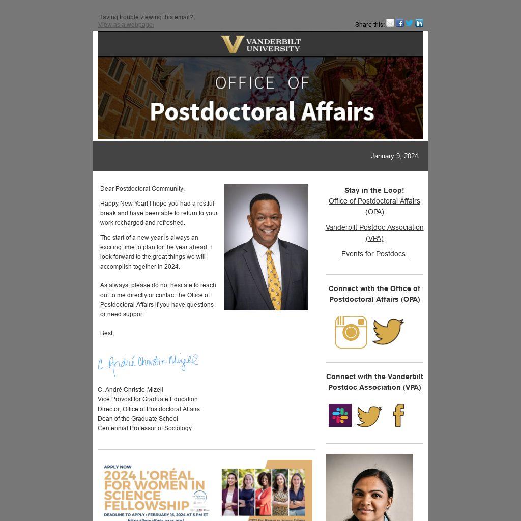 As always, please do not hesitate to reach out to me directly or contact the Office of Postdoctoral Affairs if you have questions or need support.
