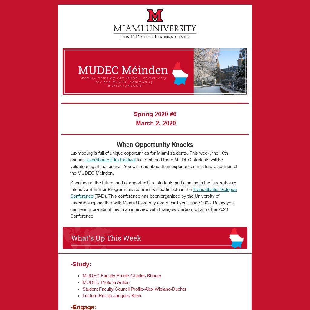 When Opportunity KnocksLuxmbourg is full of unique opportunities for Miami students. This week, the 10th annual Luxembourg Film Festival kicks off and three MUDEC students will be volunteering at the festival. You will read about their experiences in a future addition of the MUDEC Méinden.