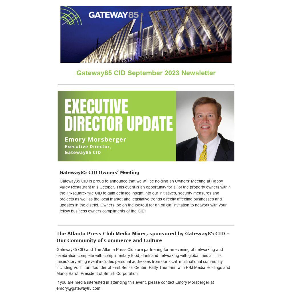Gateway85 CID is proud to announce that we will be holding an Owners’ Meeting at Happy Valley Restaurant this October. This event is an opportunity for all of the property owners within the 14-square-mile CID to gain detailed insight into our initiatives, security measures and projects as well as the local market and legislative trends directly affecting businesses and updates in the district. Owners, be on the lookout for an official invitation to network with your fellow business owners compliments of the CID!