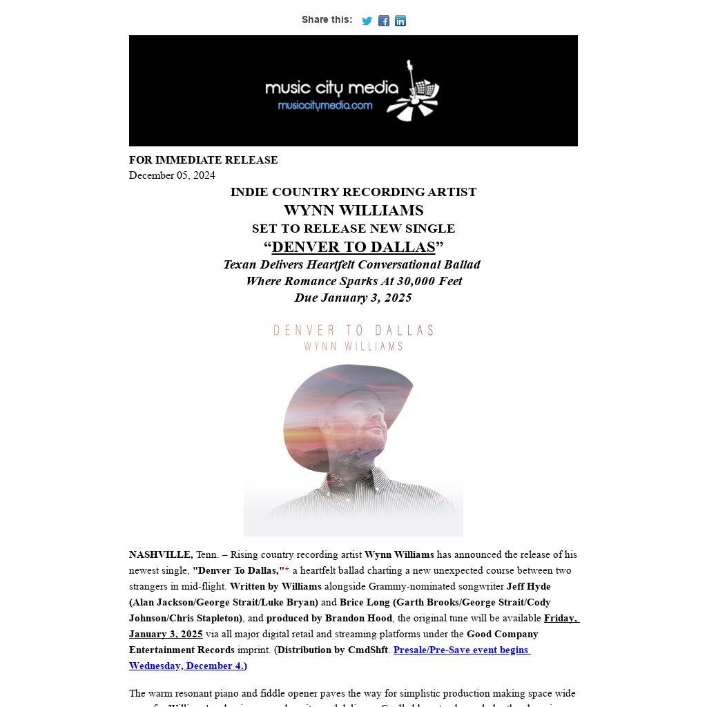 NASHVILLE, Tenn. – Rising country recording artist Wynn Williams has announced the release of his newest single, "Denver To Dallas,"* a heartfelt ballad charting a new unexpected course between two strangers in mid-flight. Written by Williams alongside Grammy-nominated songwriter Jeff Hyde (Alan Jackson/George Strait/Luke Bryan) and Brice Long (Garth Brooks/George Strait/Cody Johnson/Chris Stapleton), and produced by Brandon Hood, the original tune will be available Friday, January 3, 2025 via all major digital retail and streaming platforms under the Good Company Entertainment Records imprint. (Distribution by CmdShft. Presale/Pre-Save event begins Wednesday, December 4.)