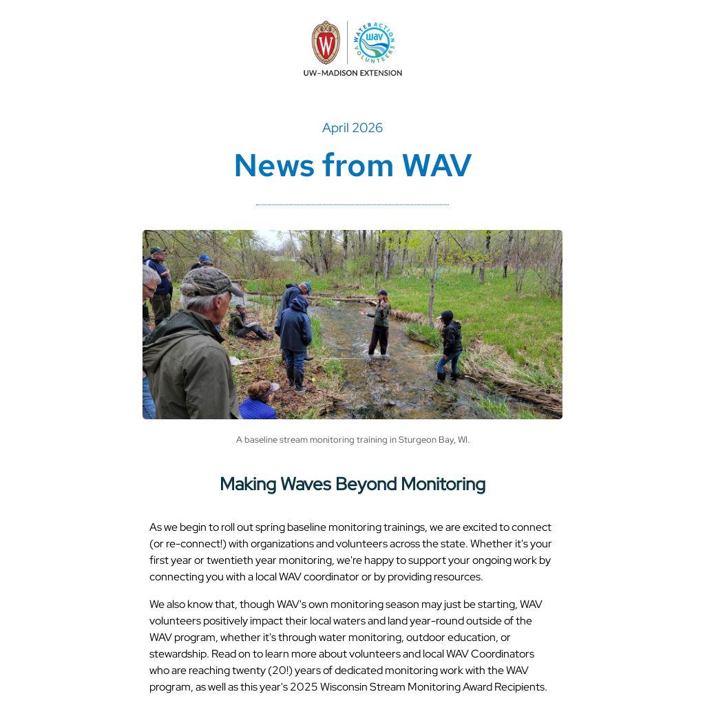 We also know that, though WAV's own monitoring season may just be starting, WAV volunteers positively impact their local waters and land year-round outside of the WAV program, whether it's through water monitoring, outdoor education, or stewardship. Read on to learn more about volunteers and local WAV Coordinators who are reaching twenty (20!) years of dedicated monitoring work with the WAV program, as well as this year's 2025 Wisconsin Stream Monitoring Award Recipients.