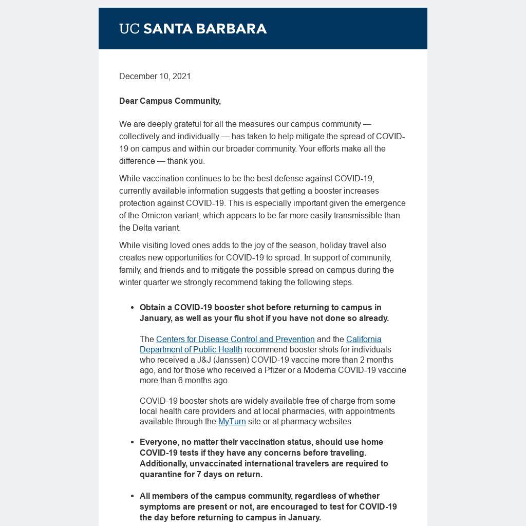 While visiting loved ones adds to the joy of the season, holiday travel also creates new opportunities for COVID-19 to spread. In support of community, family, and friends and to mitigate the possible spread on campus during the winter quarter we strongly recommend taking the following steps.