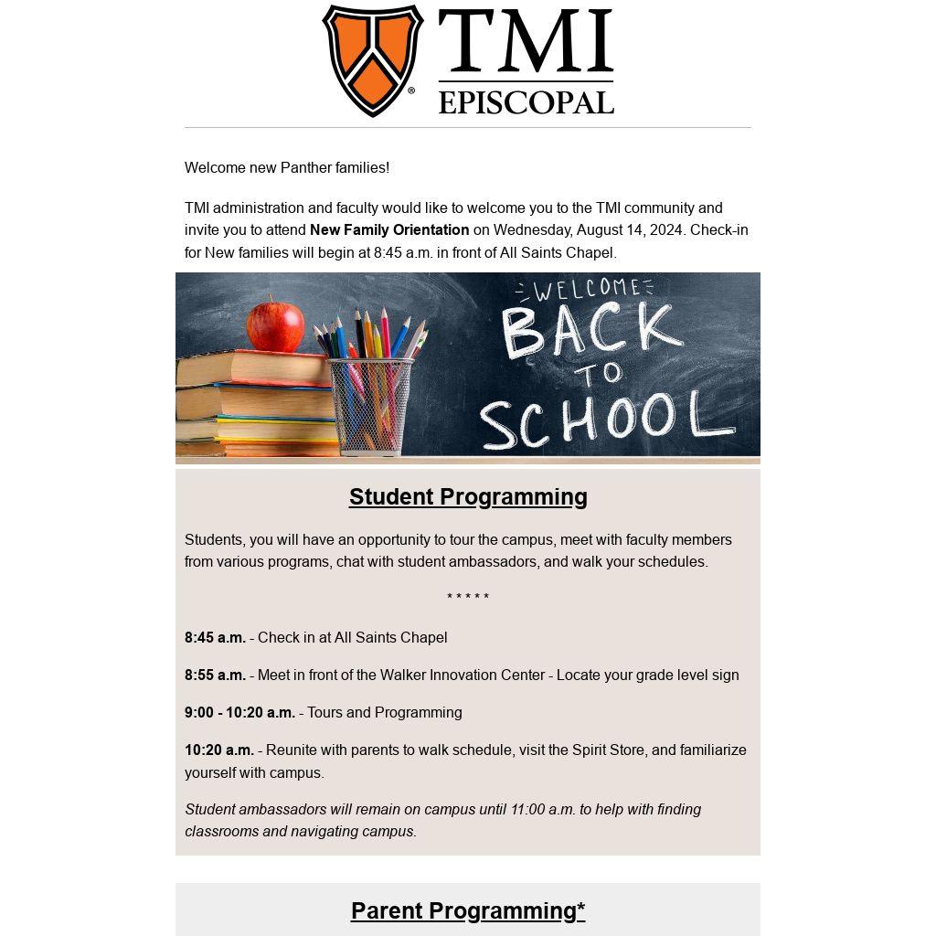 9:20 a.m. - Programming in the Chapel begins; Hear from the TMI's leadership, including President, Fr. Scott J. Brown; Head of School, Dr. Jasmine B. Harris; Head of Middle School, Liz Sanderson; Head of Upper School, Fred Kountz; and Director of Advancement, Valerie Tamez; as well as the Community Engagement Council.
