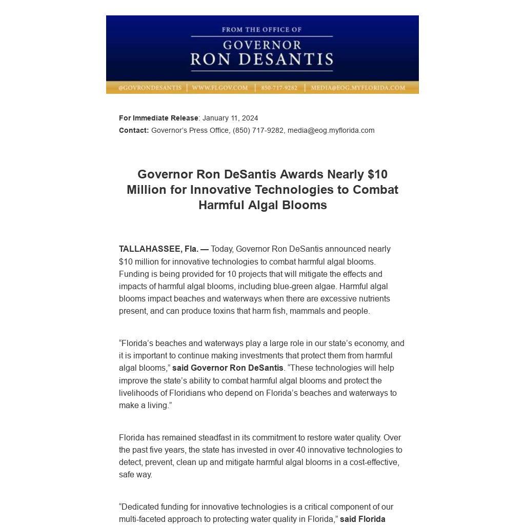 TALLAHASSEE, Fla. — Today, Governor Ron DeSantis announced nearly $10 million for innovative technologies to combat harmful algal blooms. Funding is being provided for 10 projects that will mitigate the effects and impacts of harmful algal blooms, including blue-green algae. Harmful algal blooms impact beaches and waterways when there are excessive nutrients present, and can produce toxins that harm fish, mammals and people.