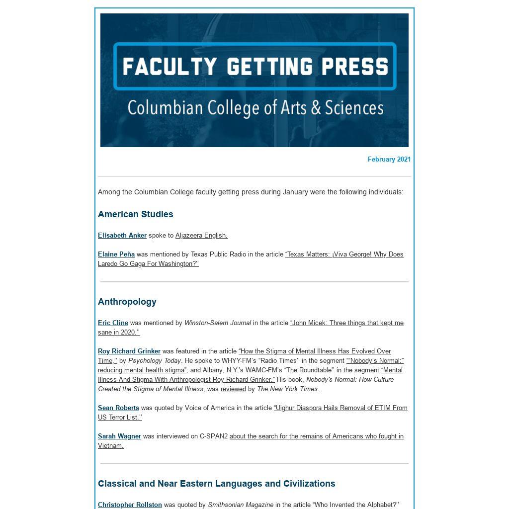 | | Among the Columbian College faculty getting press during January were the following individuals: