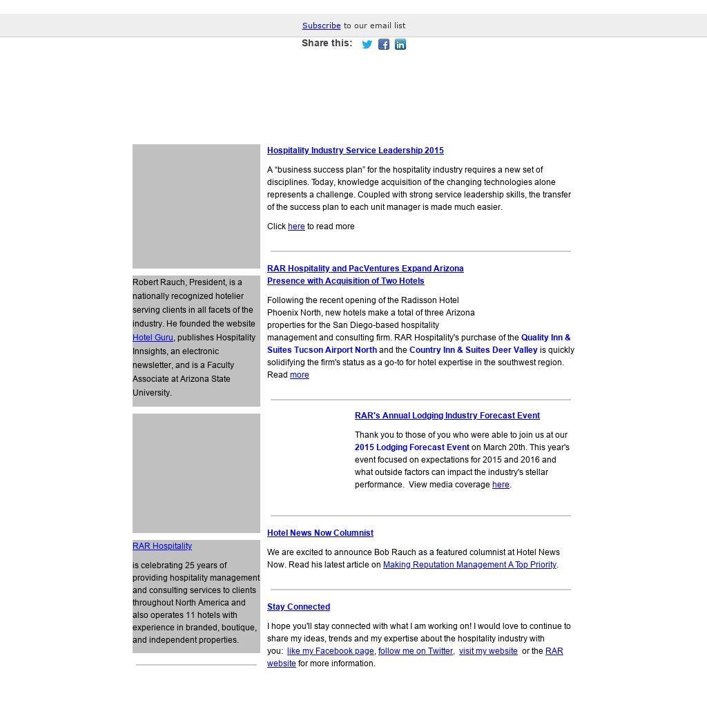Robert Rauch, President, is a nationally recognized hotelier serving clients in all facets of the industry. He founded the website Hotel Guru, publishes Hospitality Innsights, an electronic newsletter, and is a Faculty Associate at Arizona State University.