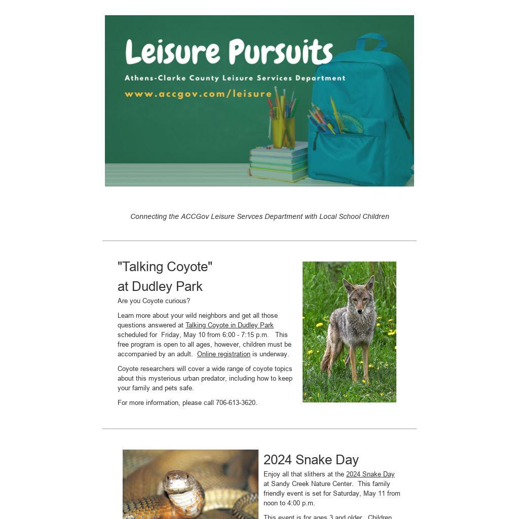 Learn more about your wild neighbors and get all those questions answered at Talking Coyote in Dudley Park scheduled for Friday, May 10 from 6:00 - 7:15 p.m. This free program is open to all ages, however, children must be accompanied by an adult. Online registration is underway.